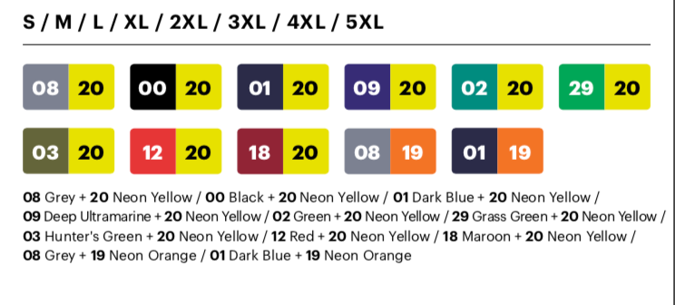 Neon yellow fabric: 80% polyester - 20% cotton / 210 gsm Neon orange fabric: 60% cotton - 40% polyester / 240 gsm Contrast fabric: 65% polyester - 35% cotton / 200 gsm
